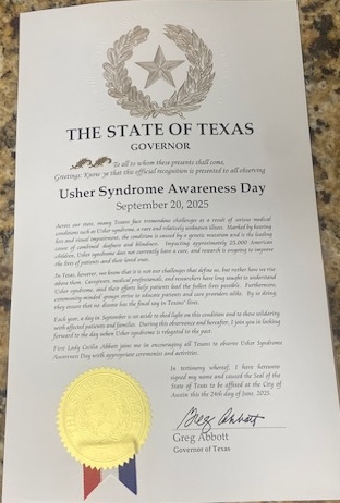 - USH Ambassador Robyn Culpepper requested and received a proclamation from Governor Greg Abbott in honor of Usher Syndrome Awareness Day.